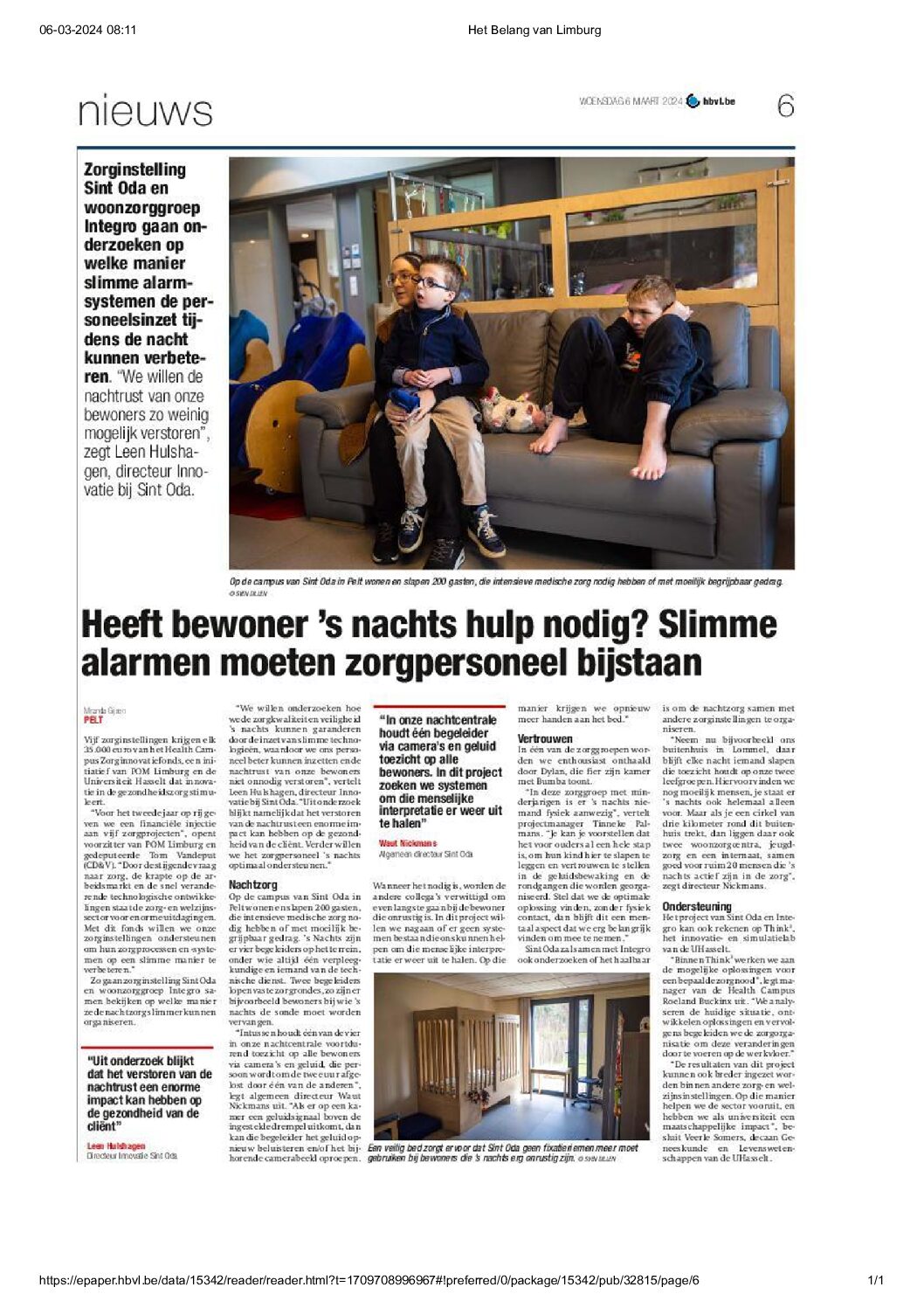 Zorginstelling Sint Oda en woonzorggroep Integro gaan onderzoeken op welke manier slimme alarmsystemen de personeelsinzet tijdens de nacht kunnen verbeteren.